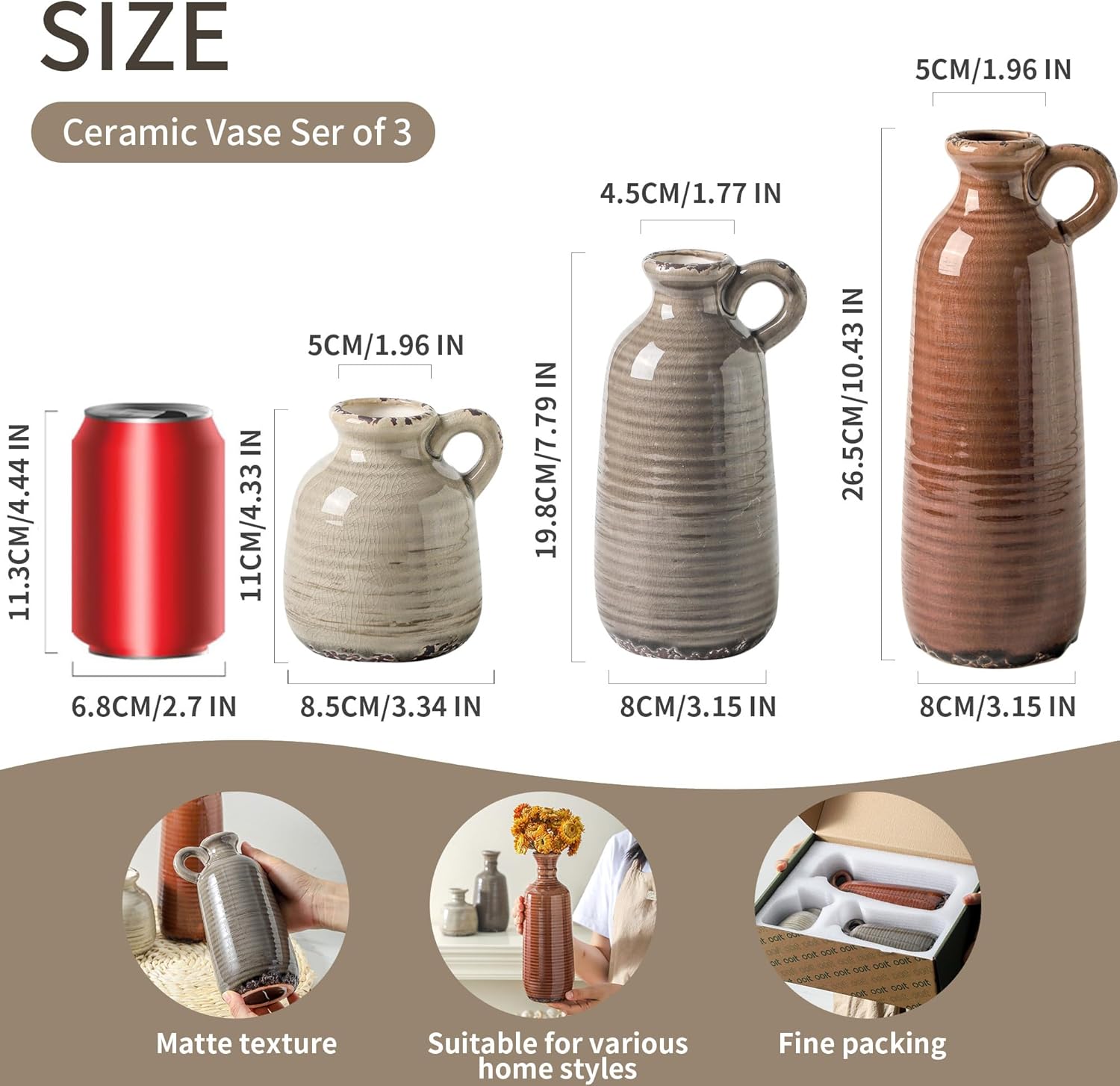 Each vase in this set features a unique shape and a textured brown finish that fits perfectly into Modern Boho and Farmhouse styles. The built-in handles add a rustic charm, making them perfect for displaying dried pampas grass or fresh seasonal flowers.