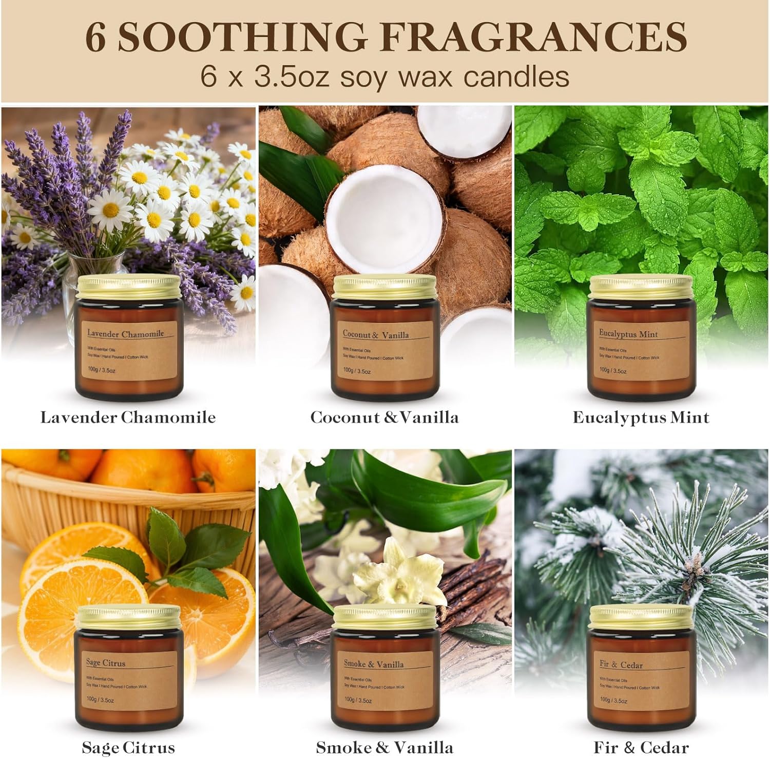 This 6-Pack Scented Candles Gift Set for Women features a variety of soothing scents to match your needs: